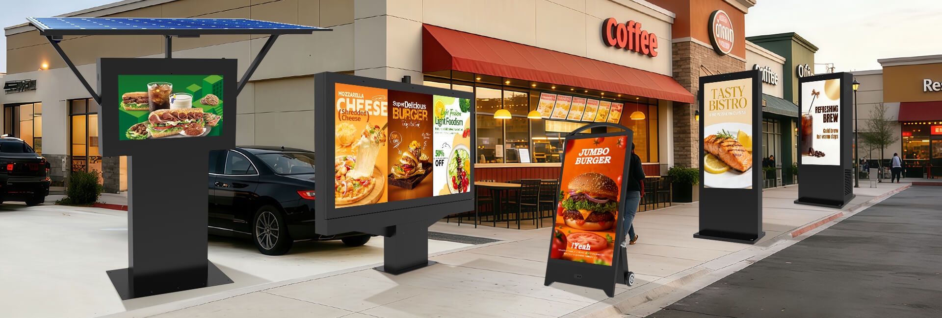 Outdoor digital signage is a type of electronic display system designed to withstand outdoor environments while delivering high-quality, dynamic content like advertisements, information, or entertainment. Outdoor digital signage is built to endure harsh weather conditions, including rain, snow, wind, and direct sunlight. These screens are typically enclosed in weatherproof casings that protect them from water, dust, and extreme temperatures. These displays are designed with high brightness levels (often 1,500 to 5,000 nits or more) to ensure clear visibility even under direct sunlight. Anti-glare coatings and automatic brightness controls help maintain screen clarity in various lighting conditions. Outdoor digital signage often features large screens, which capture the attention of pedestrians and drivers. This is ideal for conveying advertising messages or important information to a wide audience, making it highly effective in high-traffic areas.